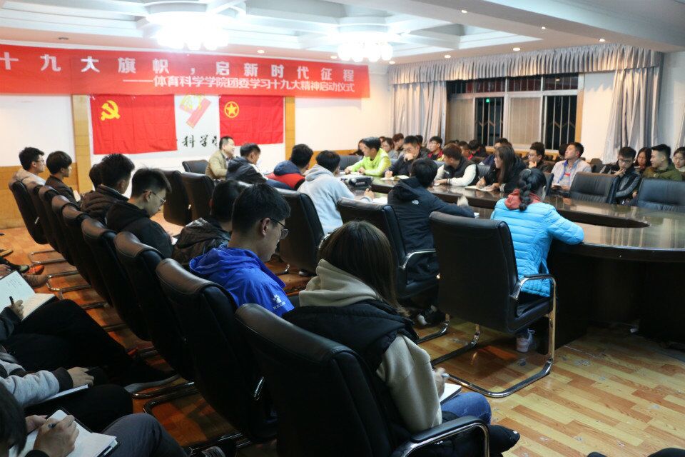 11月22日,学院团委学生会组织学习十九大精神青年读书分享会。共同学习分享十九大报告、《习近平的七年知青岁月》中的经典段落、语句,结合学院实际,畅谈感悟和收获,畅谈新时代学院改革发展的“青年担当、青年使命”;11月21日,14级运动训练1班团支部举办“青春践行十九大,不忘初心跟党走”主题团课,10余名基层团干部共同学习了十九大理论文章,重温入团誓词;
