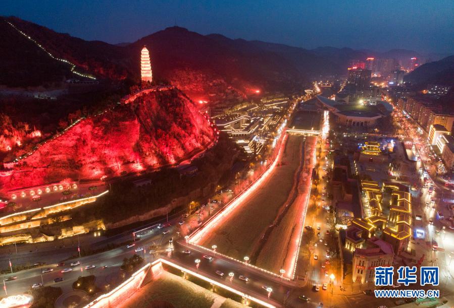 宝塔山下延安城区夜景(2月8日摄,无人机照片)。新华社记者 邵瑞 摄
