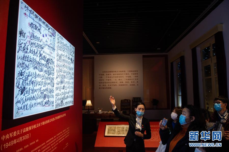 “毛泽东同志香山时期发布电报手稿专题展览”在北京香山革命纪念馆开展,讲解员(左一)向媒体记者介绍电报内容(2020年12月16日摄)。新华社记者 陈钟昊 摄