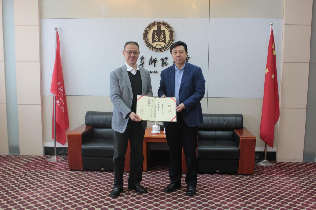 10月12日上午,华南师范大学博士生导师周爱光教授受聘我校特聘教授,校长张洪海为周爱光教授颁发聘书,院党委书记荆兆清、院长曹莉以及办公室主任王丽参加了聘任仪式。