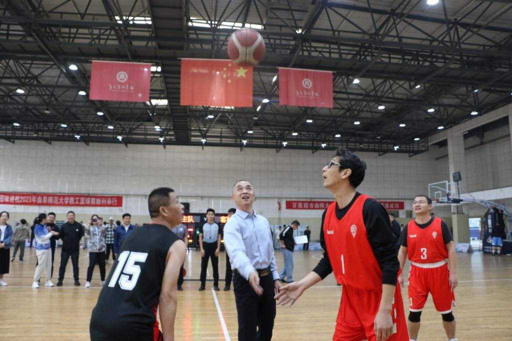 学校党委常委、副校长李兆祥为第一场篮球比赛开球。