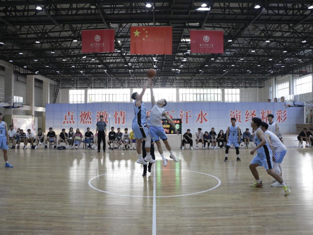 首先进行的是全明星季军战,对战双方为22联合队与研究生联合队。比赛现场十分精彩,观众热情高涨,双方运动员配合默契、奋勇拼搏,为在场观众呈现了一场别开生面、精彩绝伦的比赛,展现出了我院学子积极向上的良好精神风貌。最后经过四十分钟的激烈较量,2022联合队以82:77夺得本次季军争夺赛的胜利。