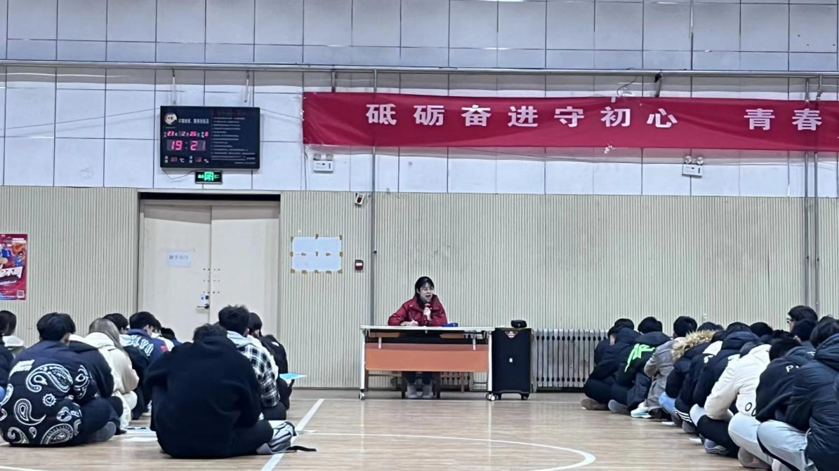 于2月27日晚7点在学院篮球馆召开全体学生会议暨安全教育大会,2022级辅导员王冰主持会议,2022级全体学生参会。