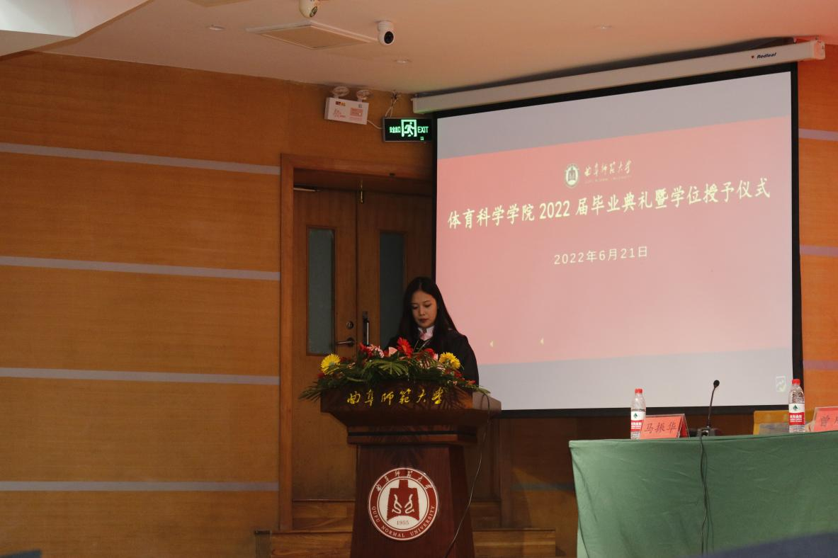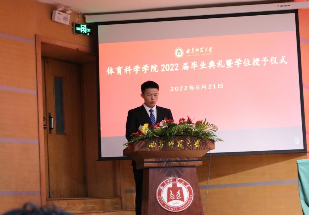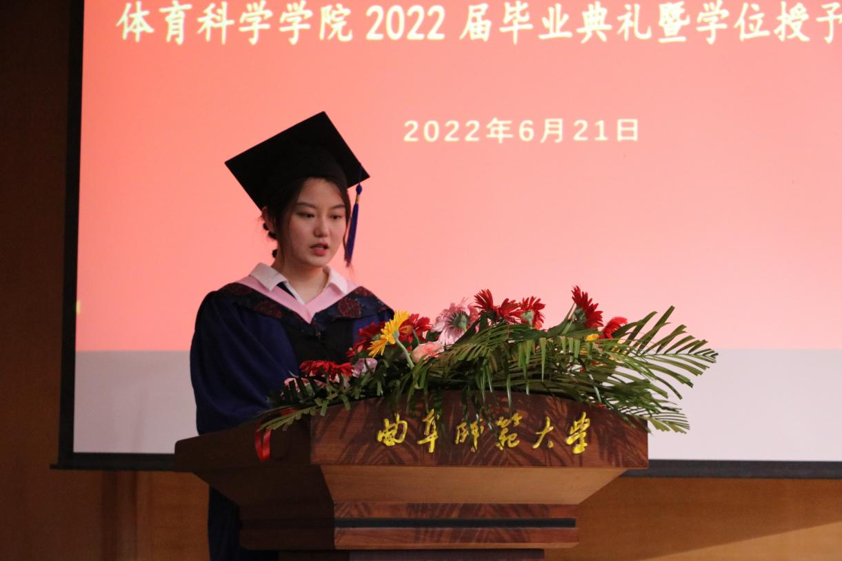 在校生代表2019级王雨在发言中,首先对顺利毕业的2022届师哥师姐表示祝贺,他承诺将与所有在校生一起接过毕业生手中的接力棒,为曲园、为学院继续助力添彩。