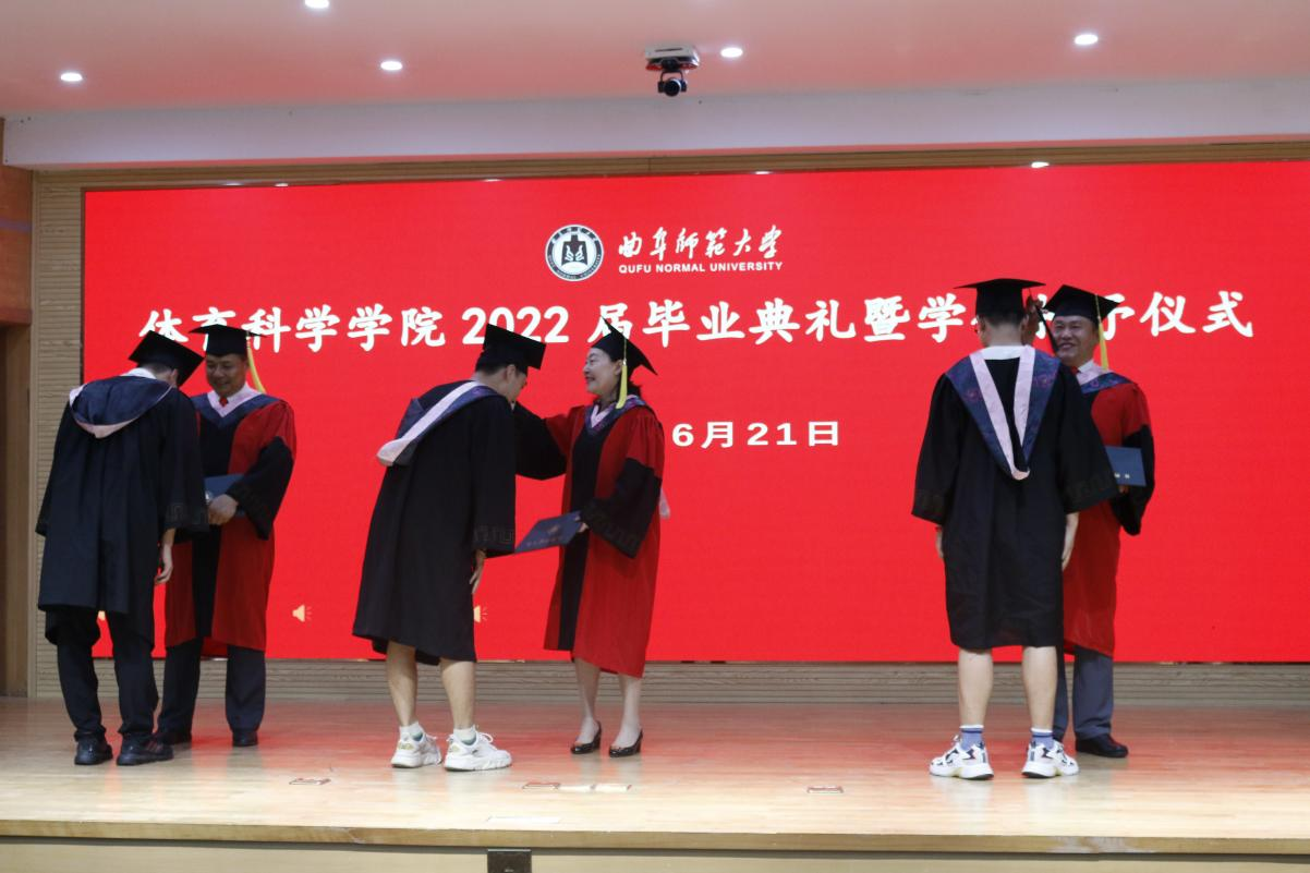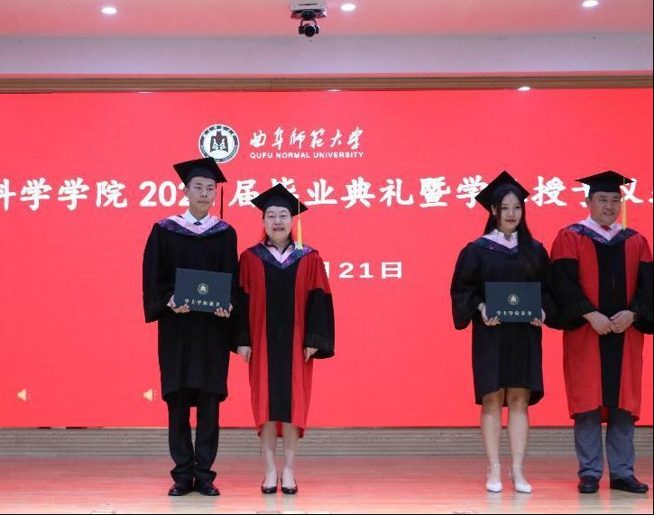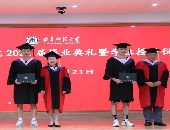 随后,播放各位领导教师及往届优秀毕业生寄语与集锦花絮, 与同学们回忆了在曲园的美好时光。最后,曹莉老师、刘敏老师、姜付高老师上台为毕业生拨穗正冠,并颁发学位证书。
