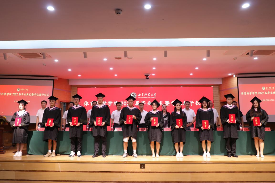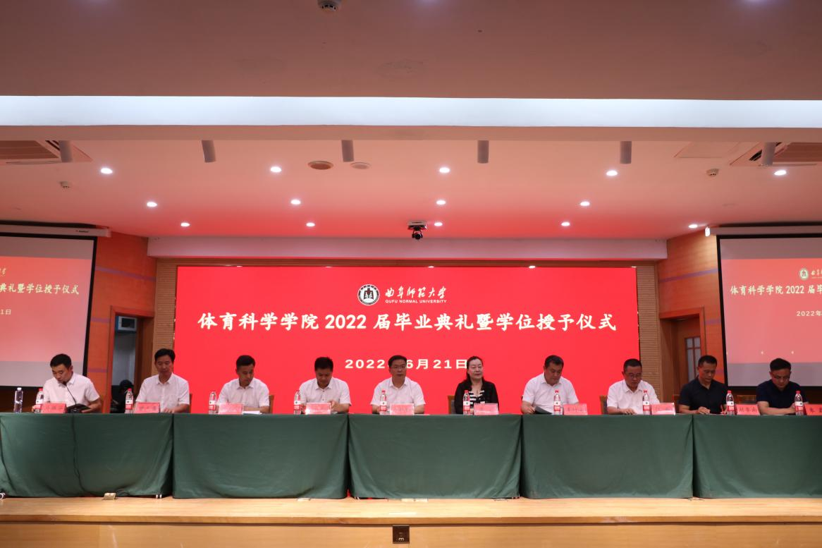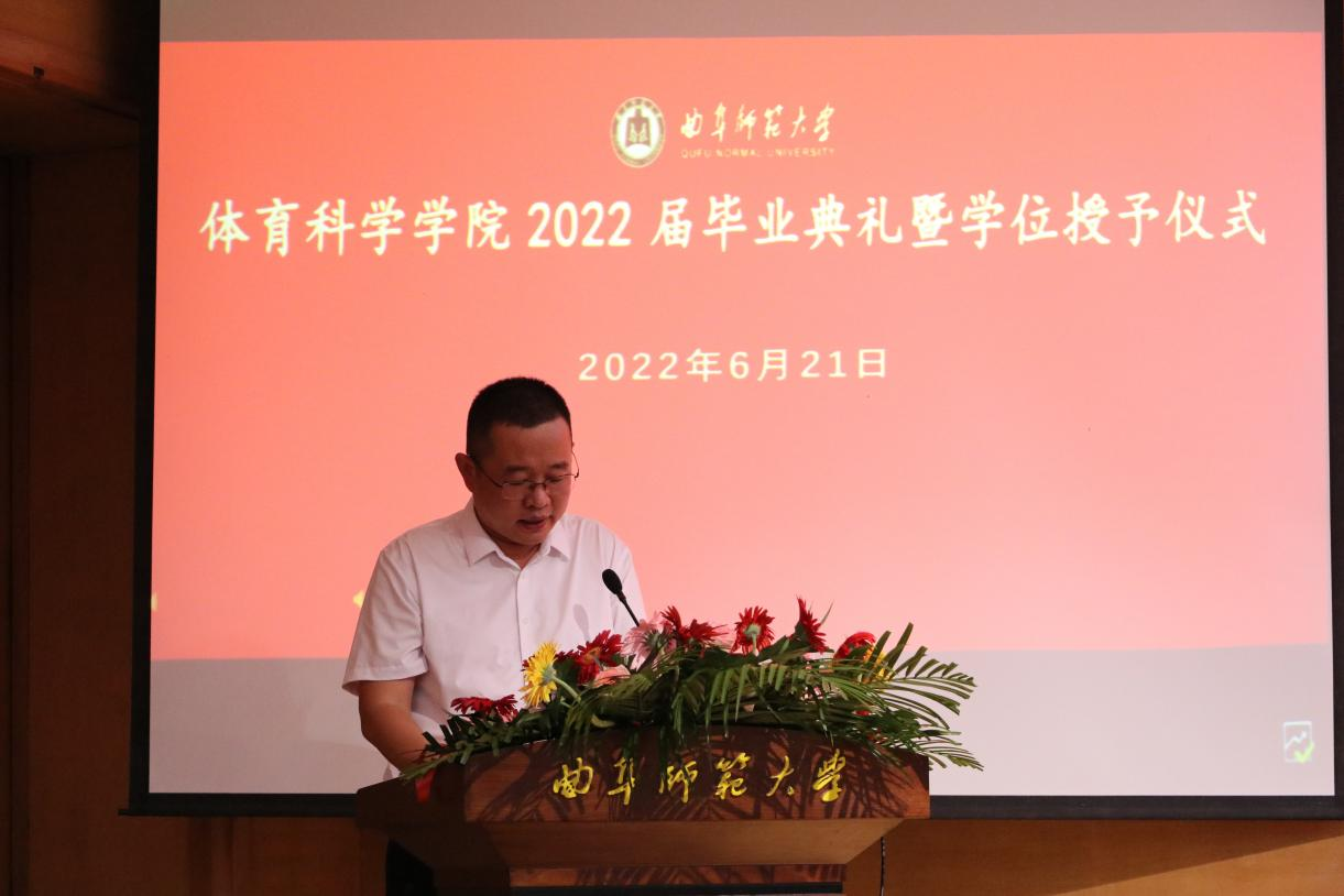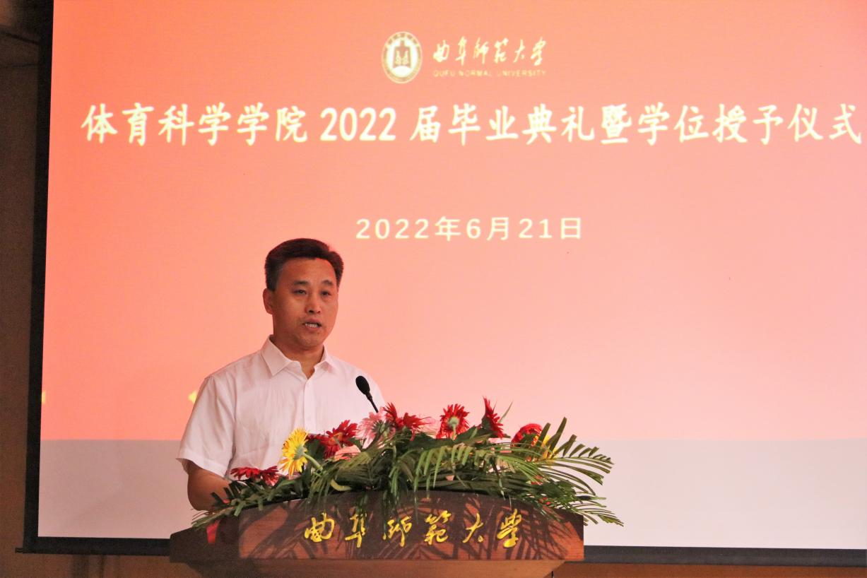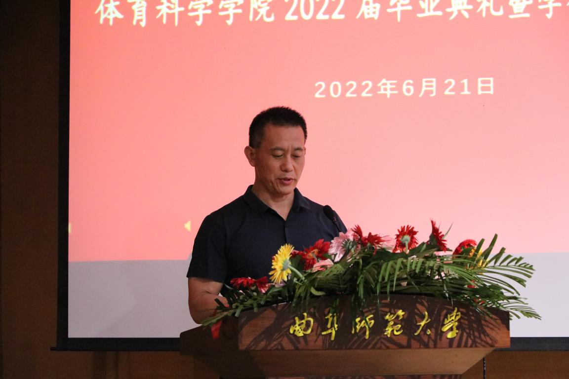 院长姜付高致辞。代表学院全体师生对2022届毕业生表示衷心祝贺,他强调,在曲园,同学们因体育而改变,收获了强健“体格”、健康“性格”和完全“人格”,今后同学们也必将为体育而逐梦。在未来的路上,希望同学们能够用体育精神立立志、善学,用行动践行体育精神,用体育讲好中国故事。
