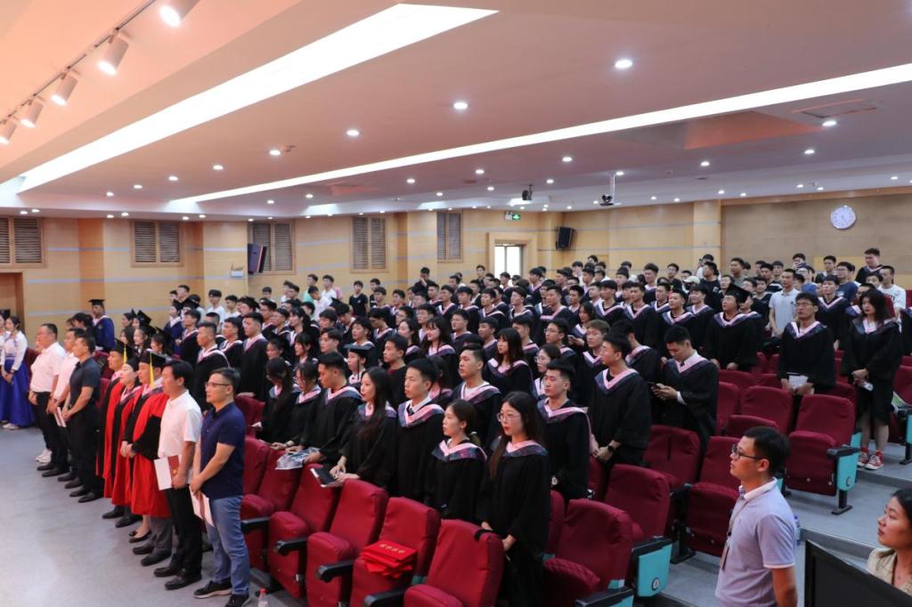 毕业典礼暨学位授予仪式在庄严的国歌声中缓缓拉开序幕,全体肃立,奏唱中华人民共和国国歌。