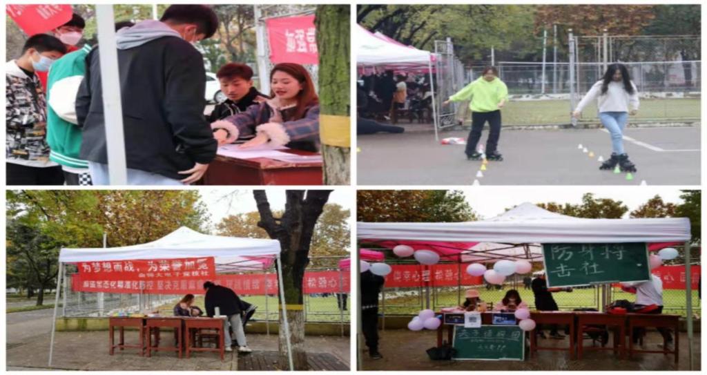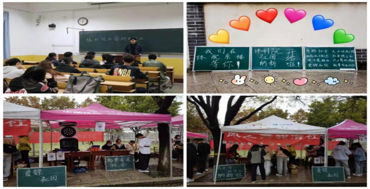 纳新的社团有:舞蹈协会、曲苑孔子射艺社、电子竞技社、爱镖社团、防身搏击社、风之舞轮滑社、跆拳有道协会、夫子话剧团等。