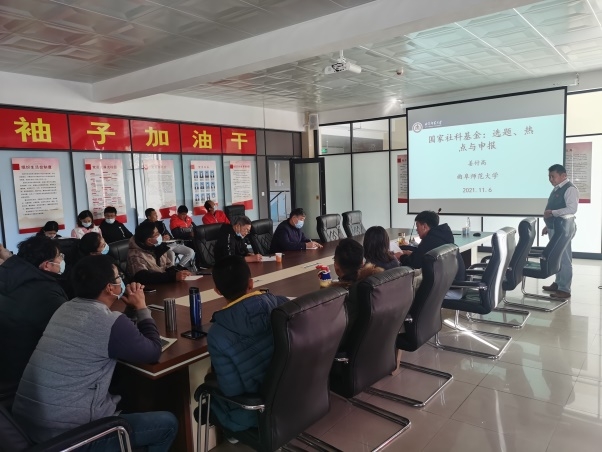 姜付高教授以《体育热点、选题与国家社科申报技巧》为题,对于体育科研选题的重要性、选题方法、选题热点以及申报书的撰写等几个方面进行详细讲解。在报告中,他以“六度空间理论”为基础,总结了体育选题要遵循的“三度”、“三点”、“五原则”,并将自己常用的7种选题方法分享给大家。他还根据申报国家社科基金课题的成功案例,重点讲述了申报书的撰写方法和技巧,指出写好申报书的重要性。讲座最后,姜教授与各位老师进行了现场交流。