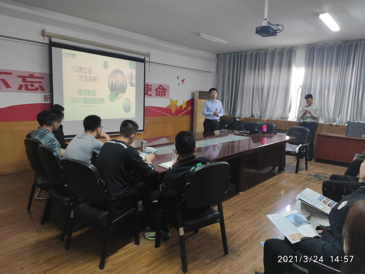德才集团成立于1999年,是一家集工程建设、装饰装修、规划设计、新材料研发与生产的大型建筑企业。招聘会上,招聘单位通过播放宣传片、ppt展示、面对面交流等方式向同学们介绍公司的概况、职业发展方向、人员需求以及选择该单位的理由等。同学们对该单位有一定了解之后,纷纷表示会后会认真思考,仔细斟酌,选择最适合的岗位和职业。