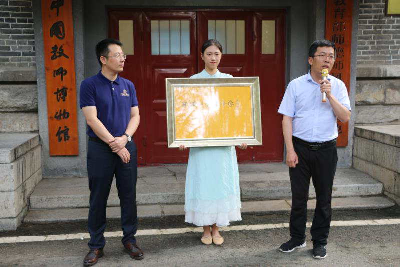 山东省教育厅援藏干部、日喀则市教育局副局长石仁勇代表第九批援藏干部管理组向中国教师博物馆捐赠十一世班禅题字“日喀则齐鲁小学”,中国教师博物馆馆长孙祥广向其颁发了捐赠证书。