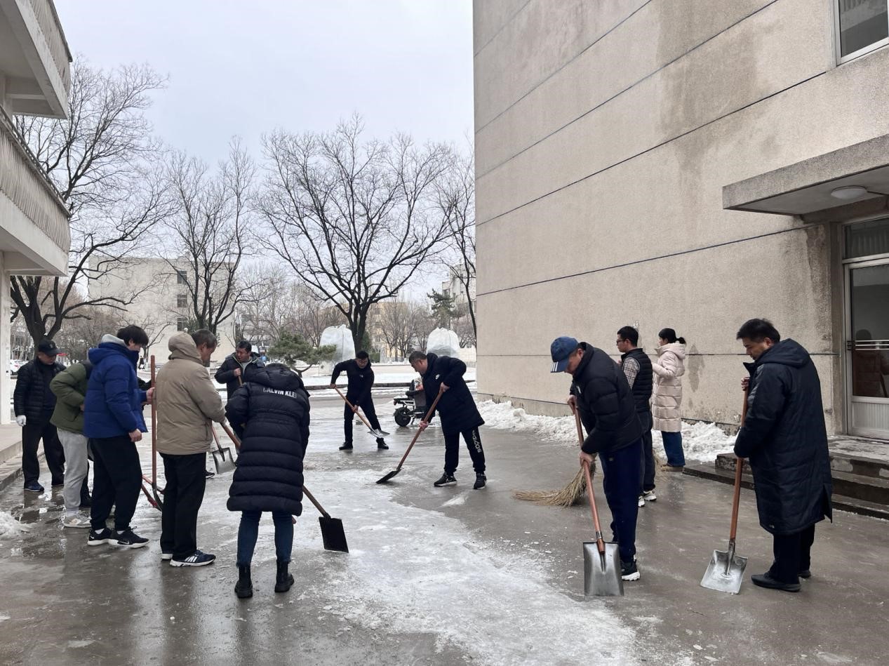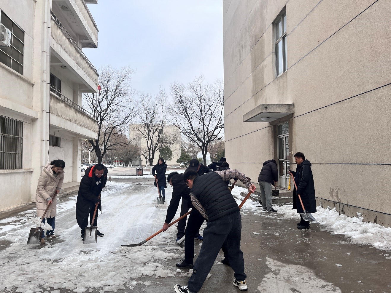 院长姜付高带队,行政和教辅人员以及学生志愿者在学院周边、主干道等处开展扫雪除冰行动。