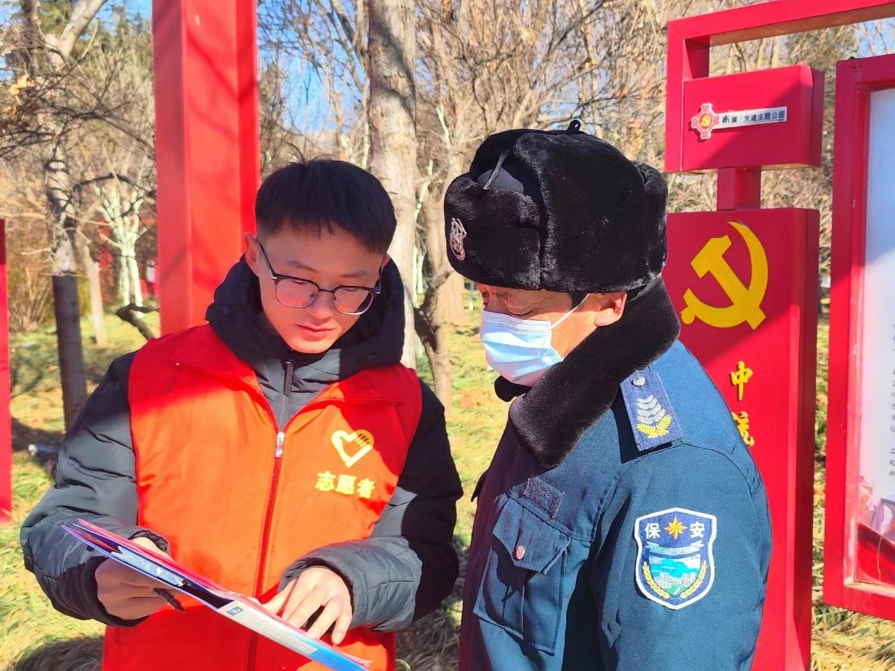 图为实践队员与安保人员进行问卷普及。吴鑫鑫 供图
