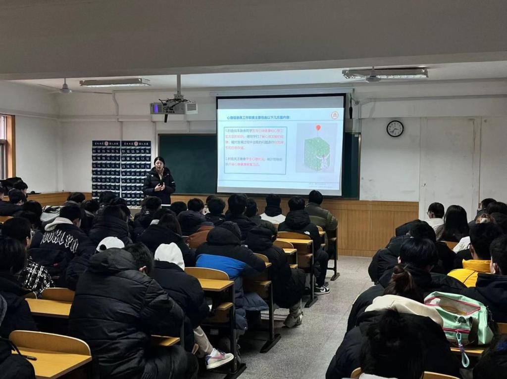 心理辅导员王冰在体育楼110教室开展班级心理委员与宿舍心理信息员培训,学院全体心理委员和心理信息员参加培训。