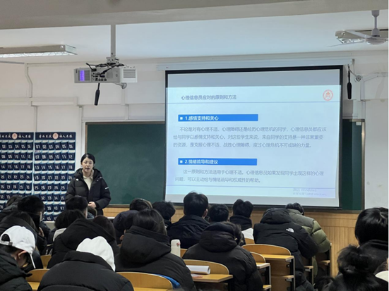 心理辅导员王冰在体育楼110教室开展班级心理委员与宿舍心理信息员培训,学院全体心理委员和心理信息员参加培训。