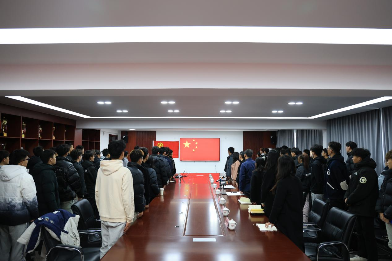 会议伊始,全体起立、奏唱国歌。