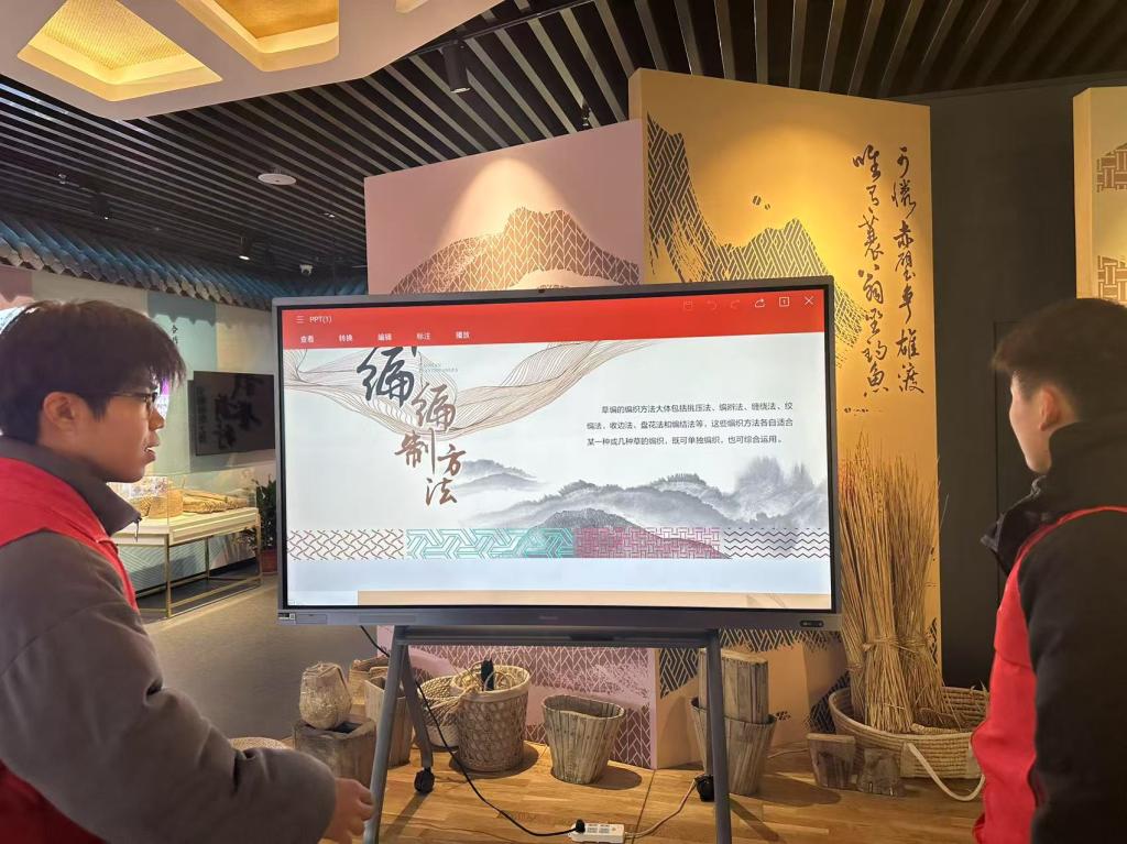 图为实践队员通过观看ppt了解草编