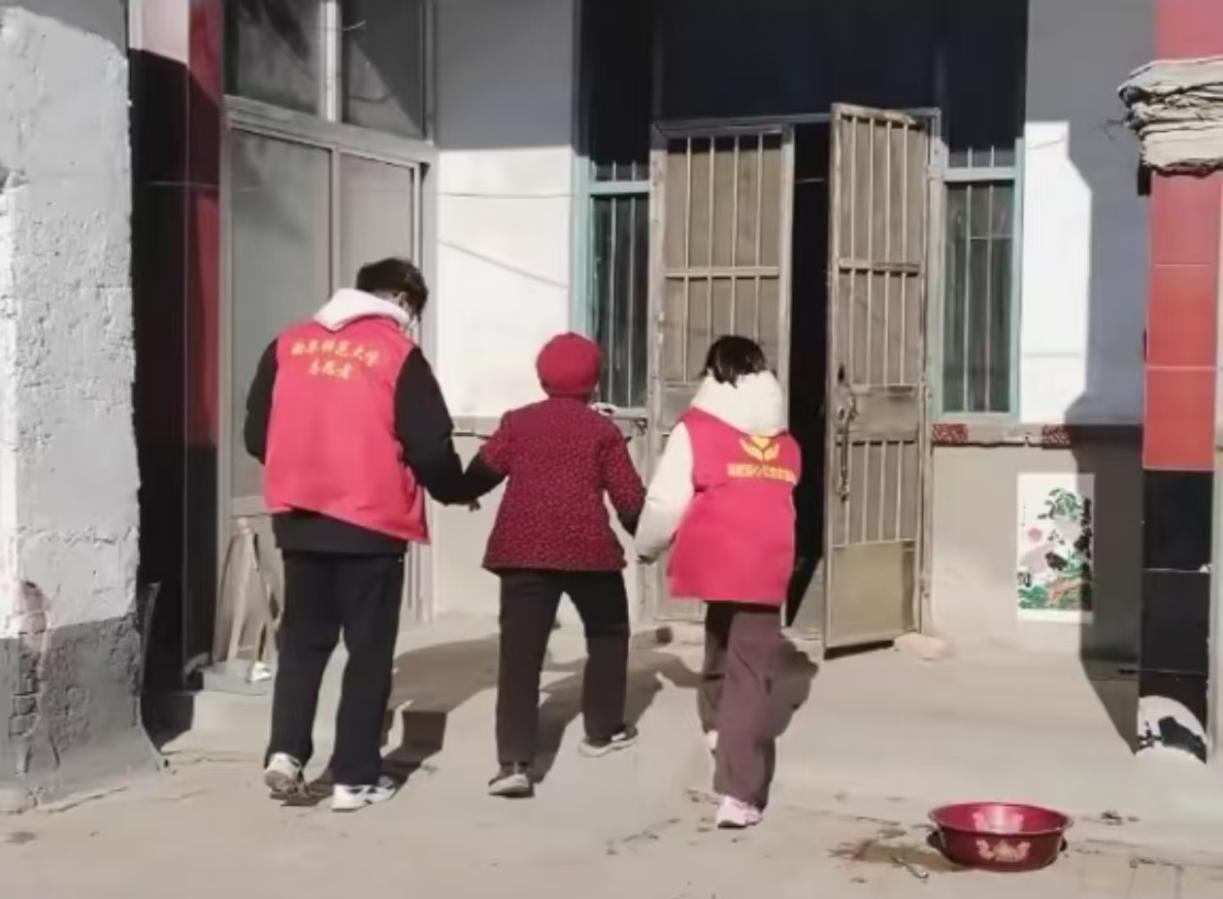 图为志愿者搀扶年迈的老人进屋 实践队员梁涵硕 供图
