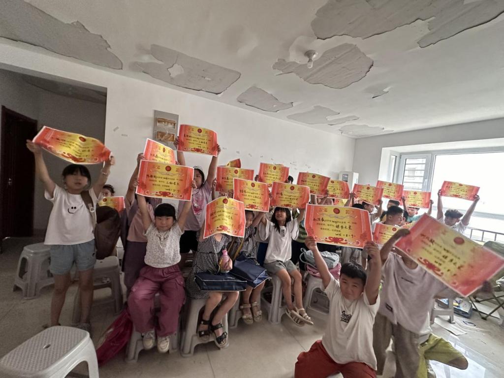 活动尾声,还为表现优秀的孩子颁发了“进步之星”等荣誉证书,以此鼓励他们在学习和生活中继续保持积极进取的态度。拿到证书的孩子们难掩喜悦,高高举起证书,定格下这一充满成就感的瞬间。
