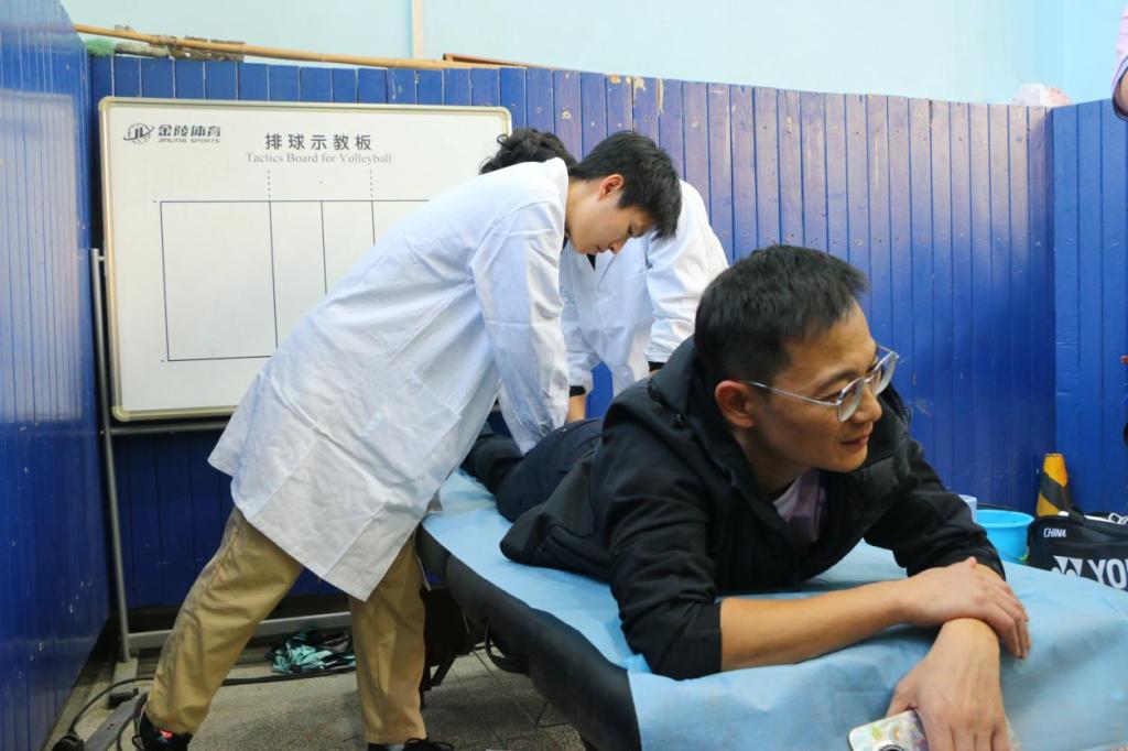 师生志愿者团队依托运动康复与体医融合的专业背景,针对羽毛球运动的特点,在赛场边设立了专属按摩放松区。志愿者们运用专业手法,重点针对参赛选手的肩袖肌群、腕肘关节、大腿及小腿肌群进行放松与梳理,有效缓解因频繁起跳、跨步、挥拍带来的肌肉紧张与疲劳,促进身体机能快速恢复,助力选手以更好状态迎接后续赛程。
