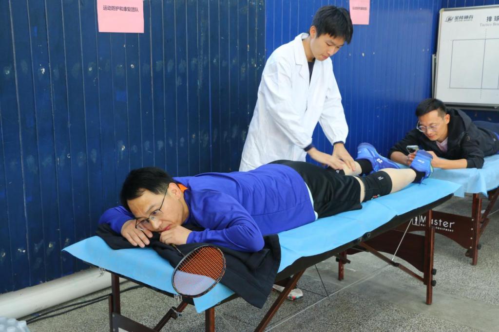 (图为志愿者为羽毛球参赛老师和同学进行针对性放松)