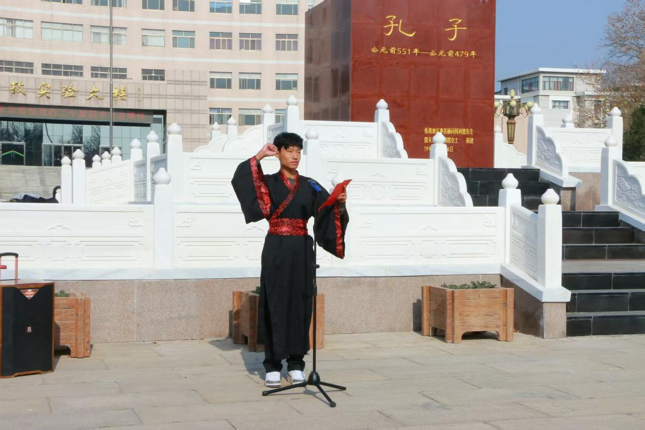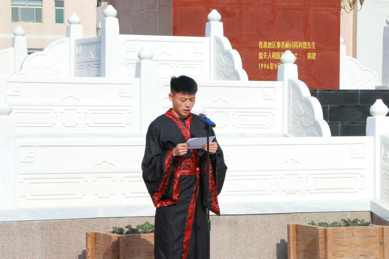 仪式现场庄重肃穆,在礼乐悠扬中拉开序幕。学子们肃立致意,随后共同面谒至圣先师孔子像,行三揖之礼,传承“尊师重教”的千年文脉,呼应《礼记》“冠者,礼之始也”的古训。随后正宾教师代表依次入场,为学子们“加冠加笄”,轻柔动作间承载着长辈的期许与社会的认可,标志着同学们正式步入成年,开启独立担当的人生新程。在学生代表于子涵的领誓下,全体学子高举右拳,以铿锵誓言许下“青春无畏,强国有我”的承诺,誓言声响彻曲园上空,尽显新时代青年的责任担当。