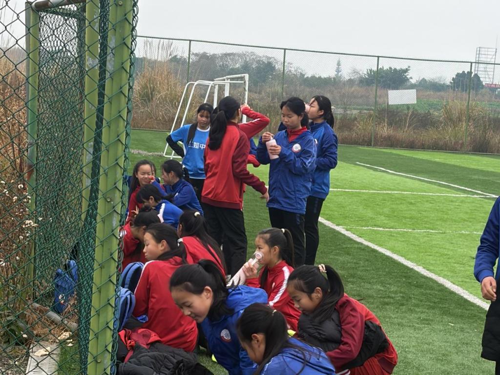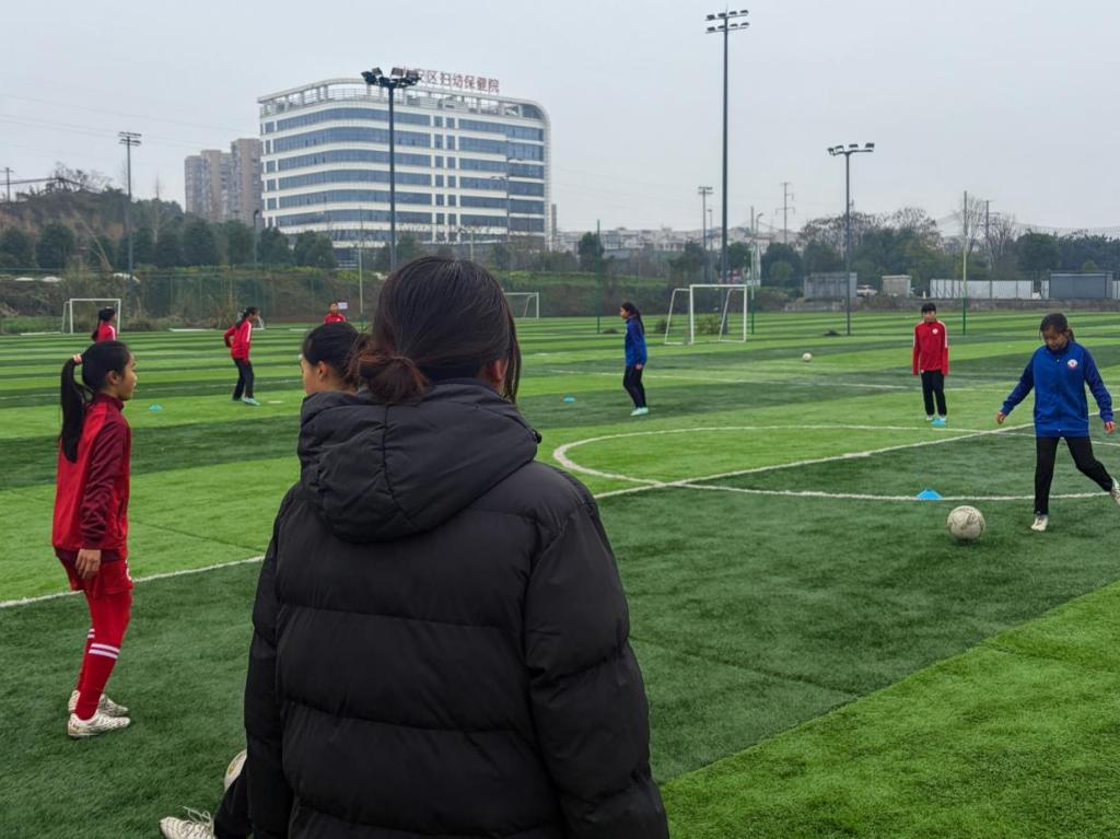 在冬日的足球场上,荣校兴教青春筑梦先锋队的队员正站在场边,专注观察身着红蓝训练服的小球员们开展分组对抗训练。远处的妇幼保健院大楼与城市建筑群,为这场充满活力的训练场景增添了独特的城市印记。