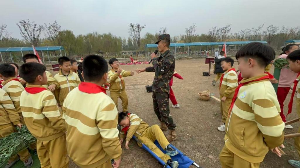活动伊始,实践团队围绕国防安全主题展开系统教学。在开阔的训练场上,实践队员身着迷彩服化身指导教师手持扩音设备,面向围绕身旁的中小学生,详细讲解战场救护与应急救援知识。通过担架使用的现场演示、急救流程的规范操作,将抽象的安全知识转化为具象的实践技能,在潜移默化中强化了参与学生的安全意识和责任担当。