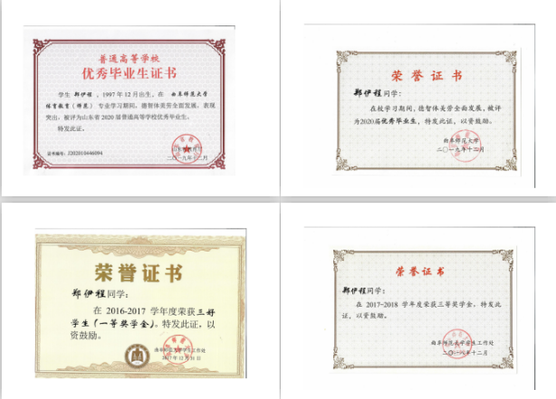 社会实践团队三等奖,还获得了2018 年央视春晚曲阜分会场演出证书、 曲阜国际圣城半程马拉松起终点裁判员证书和武状元杯优秀志愿者证书;在技能方面考取了全国计算机等级考试二级合格证书、 教师资格证-高级中学(体育与健康)、体能训练师、普通话水平测试等级证书、排球二级裁判员证和英语四级。