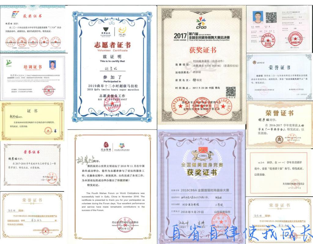 2018年获得国家励志奖学金、山东省社会实践优秀个人、校级三好学生、国家运动营养师资格证、高中教师资格证;